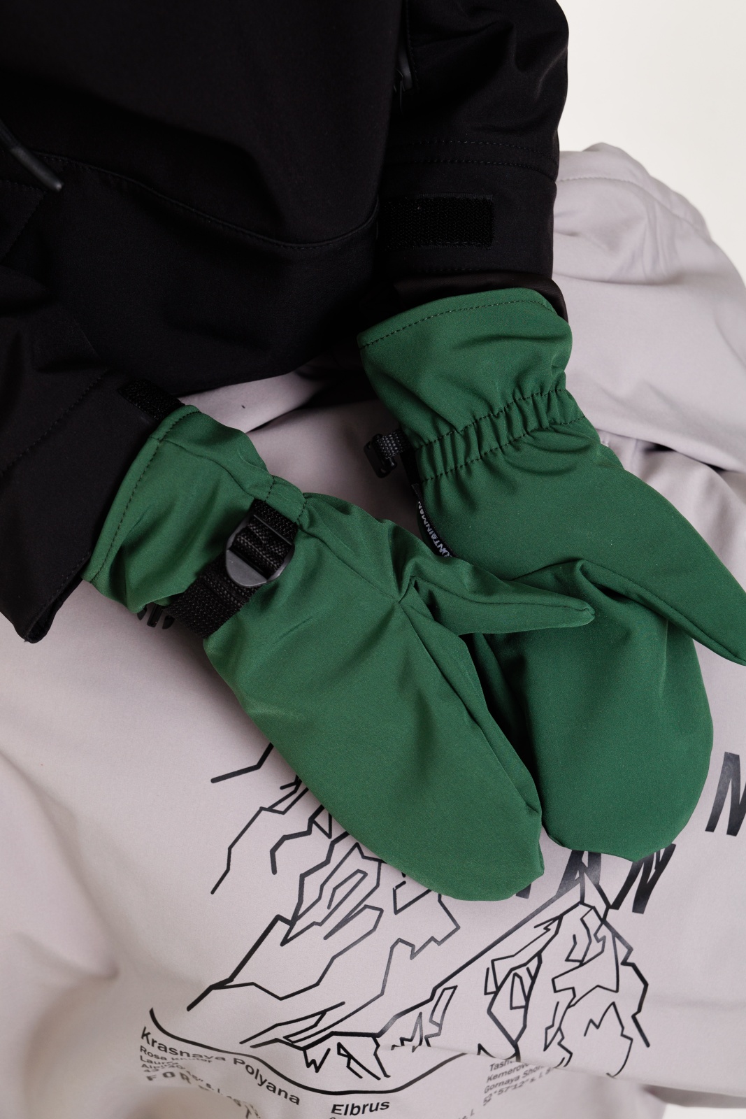 • Резинка и стропа на запястье: препятствуют попаданию снега внутрь варежек, обеспечивая дополнительную защиту.