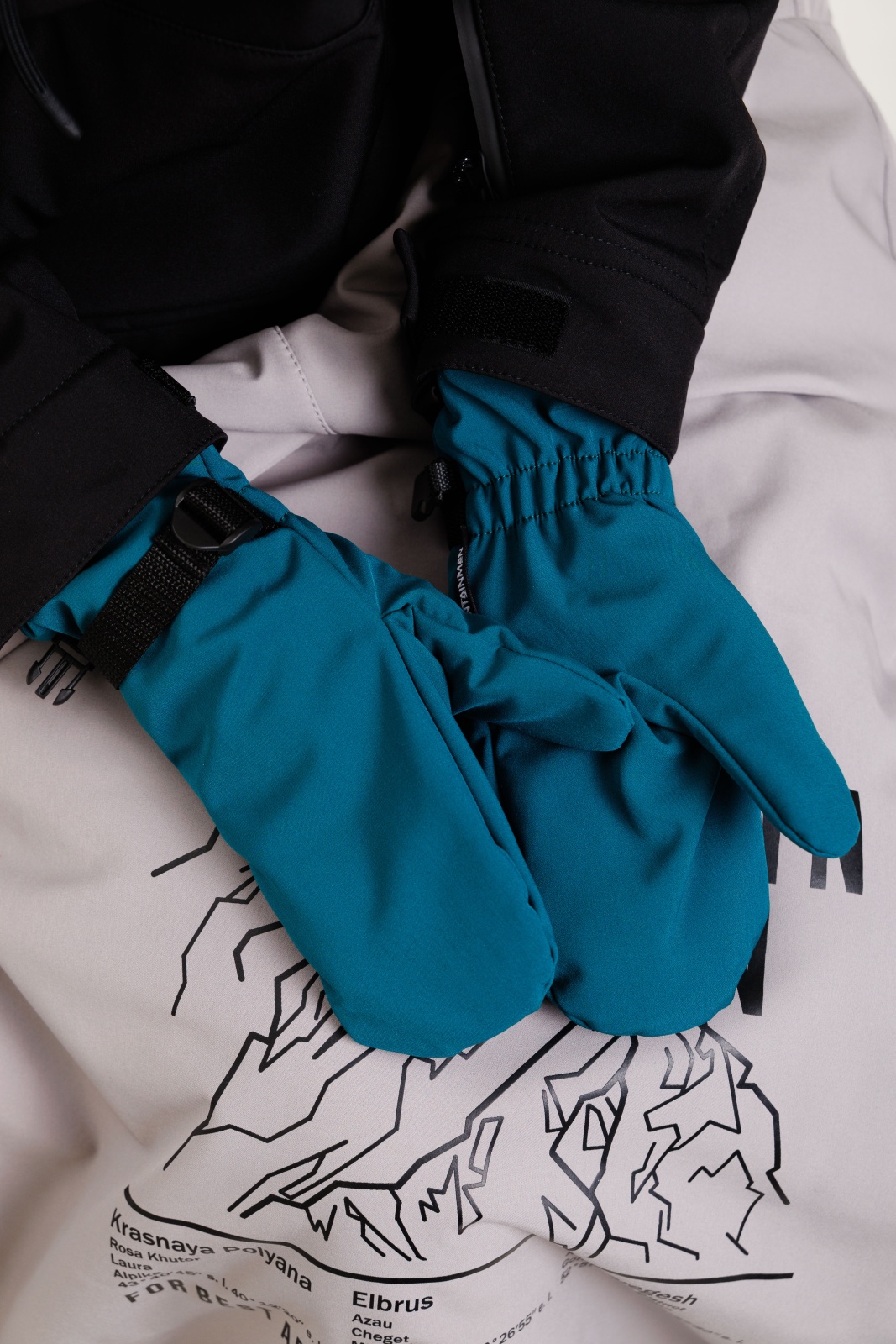 • Резинка и стропа на запястье: препятствуют попаданию снега внутрь варежек, обеспечивая дополнительную защиту.