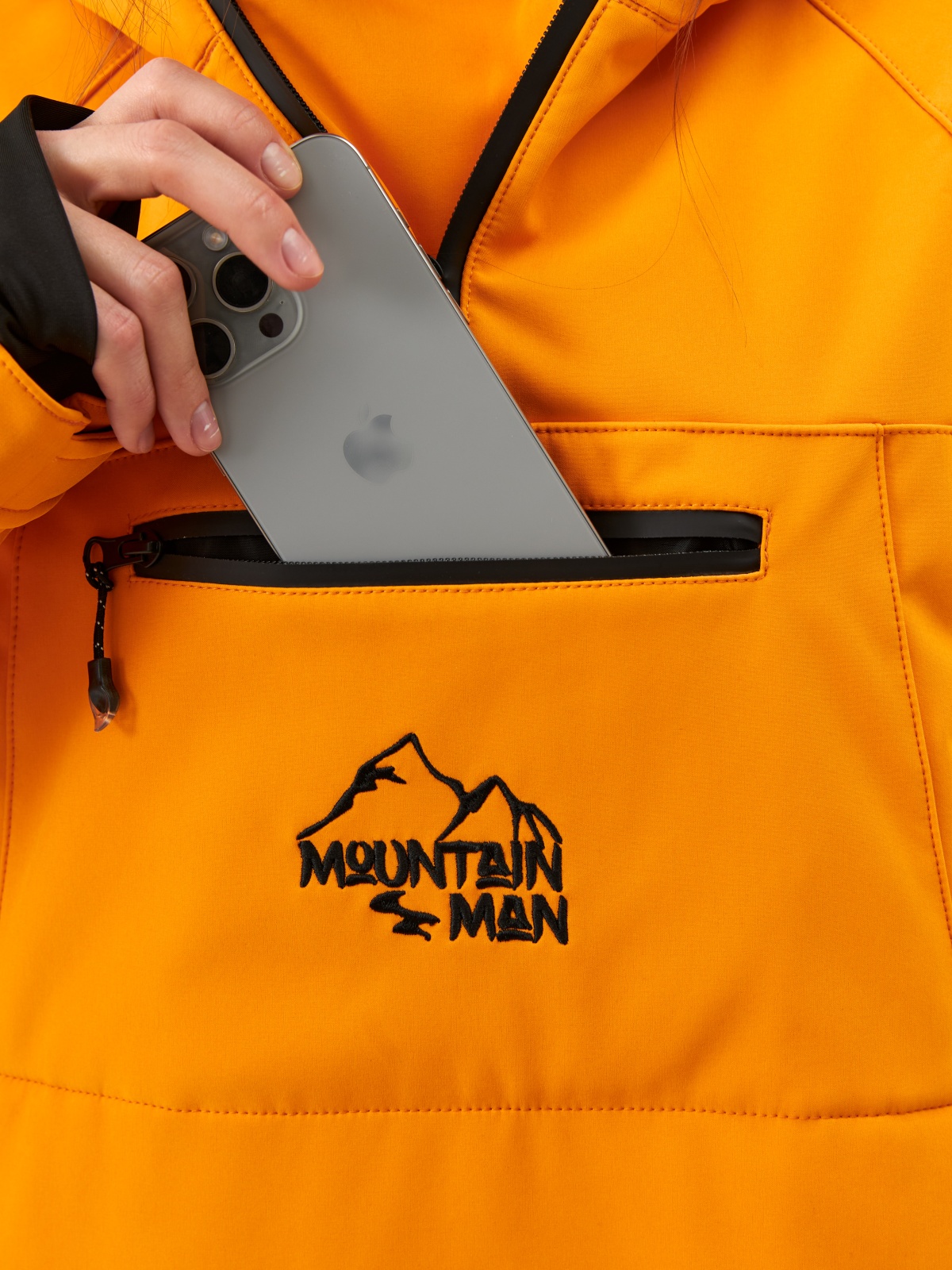 • Карман на рукаве для ski-pass, нагрудный карман для мелочей и вместительный карман-кенгуру — все на влагозащитных молниях.